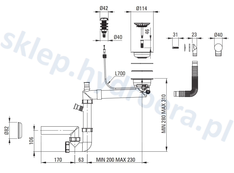 Syfon przeznaczony jest do wpuszczanego zlewozmywaka granitowego, 1-komorowego.