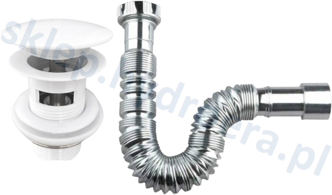 Syfon do umywalki rurkowy chromowany + korek klik klak biały z przelewem