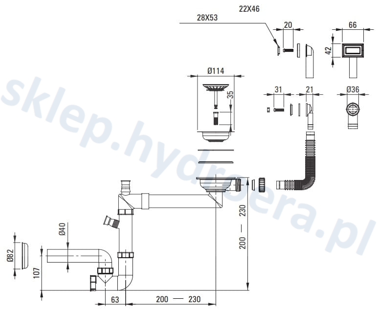 - Syfon przeznaczony do wpuszczanych zlewozmywaków granitowych, 1-komorowych