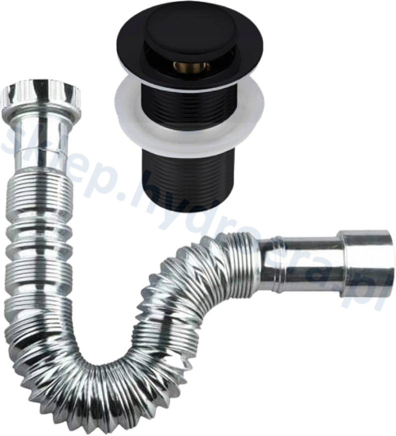 Syfon umywalki elastyczny chrom + korek klik klak czarny bez przelewu